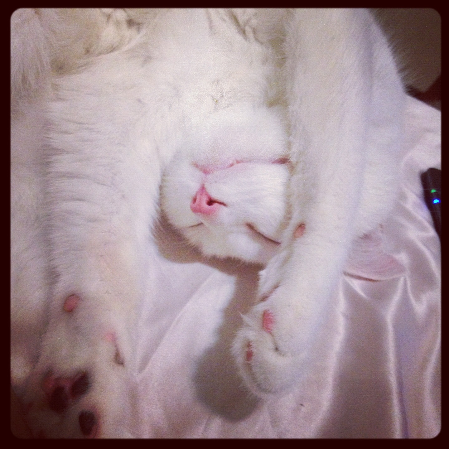 Is it Tiger Mom of me to constantly suspect this cat of fatness? There are certain positions from which Mimi looks flabby, and when she rolls into those poses I invariably exclaim, “What a fat cat!” But most of the time when she isn’t displaying her fluffy stomach she looks very trim and healthy, a perfectly formed, sparkling, white cat. I used to have ambitions for her to learn to use the toilet like those cats on Youtube, but she did not find the videos instructional. I accepted her for what she is, a stupid cat that uses the disgusting litter box.